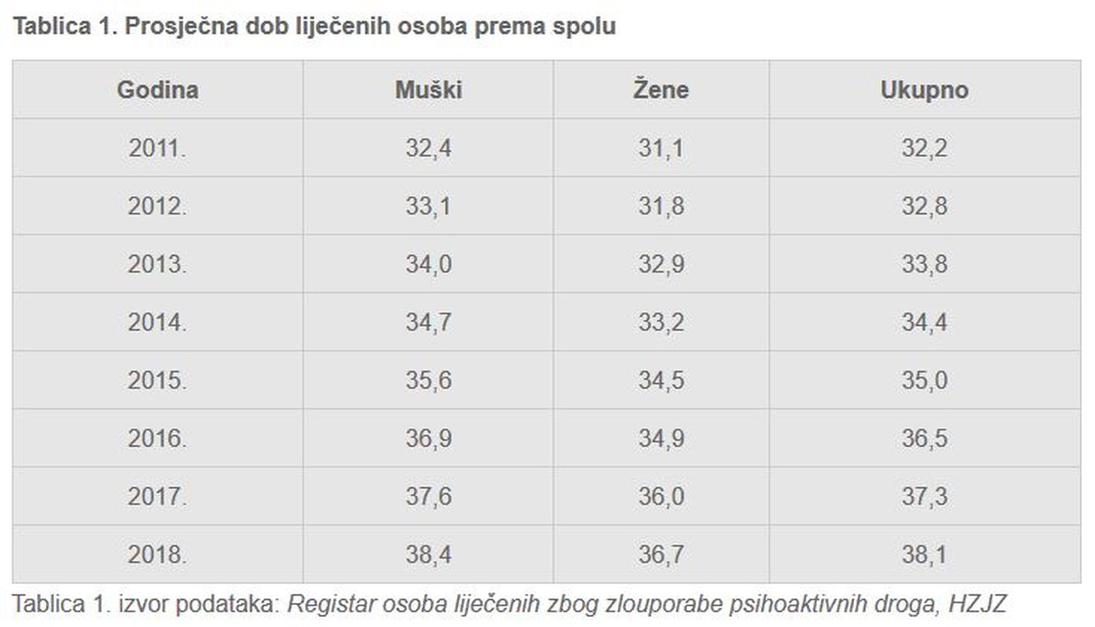 Prosječna dob liječenih osoba (Screenshot: HZJZ) -