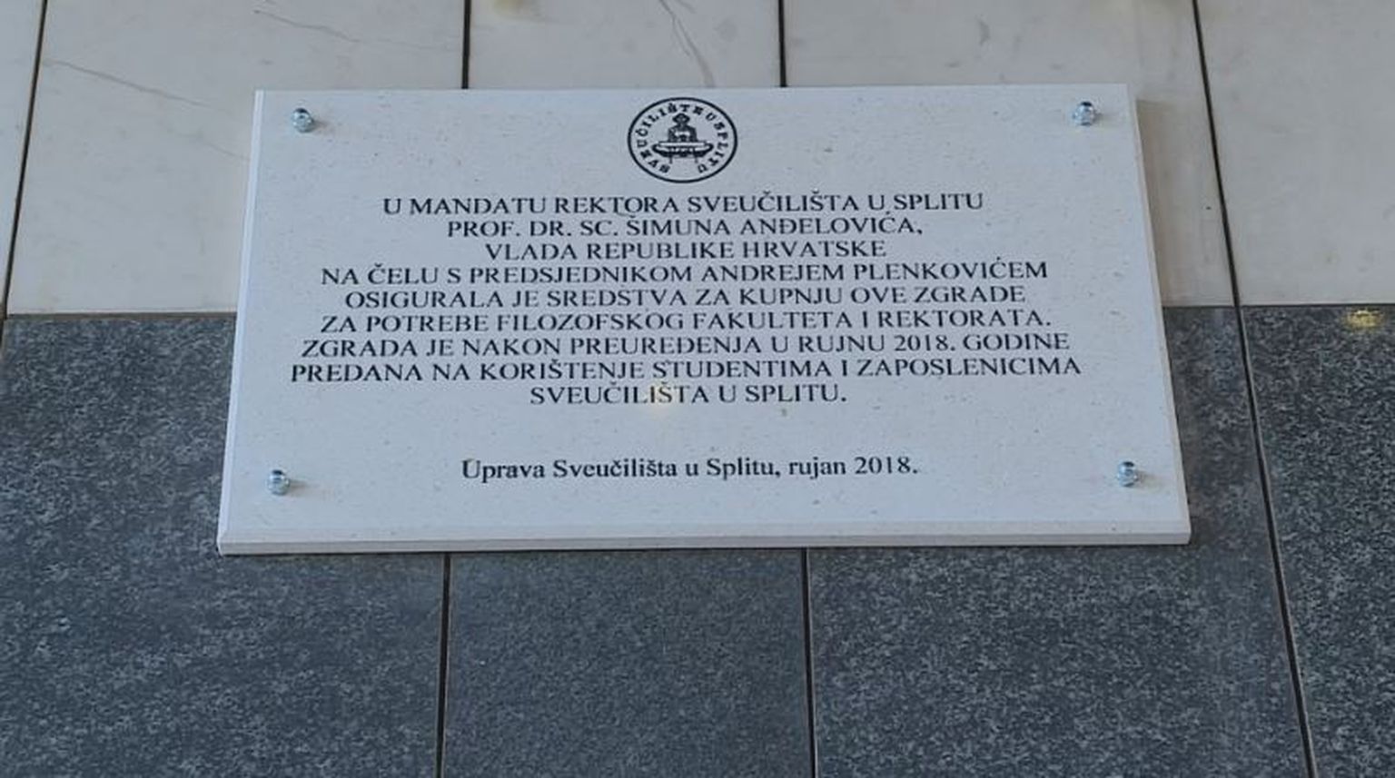 Ploča s krivo napisanim prezimenom Šimuna Anđelinovića, rektor Sveučilišta u Splitu (Foto: Dnevnik.hr) Foto: DNEVNIK.hr -