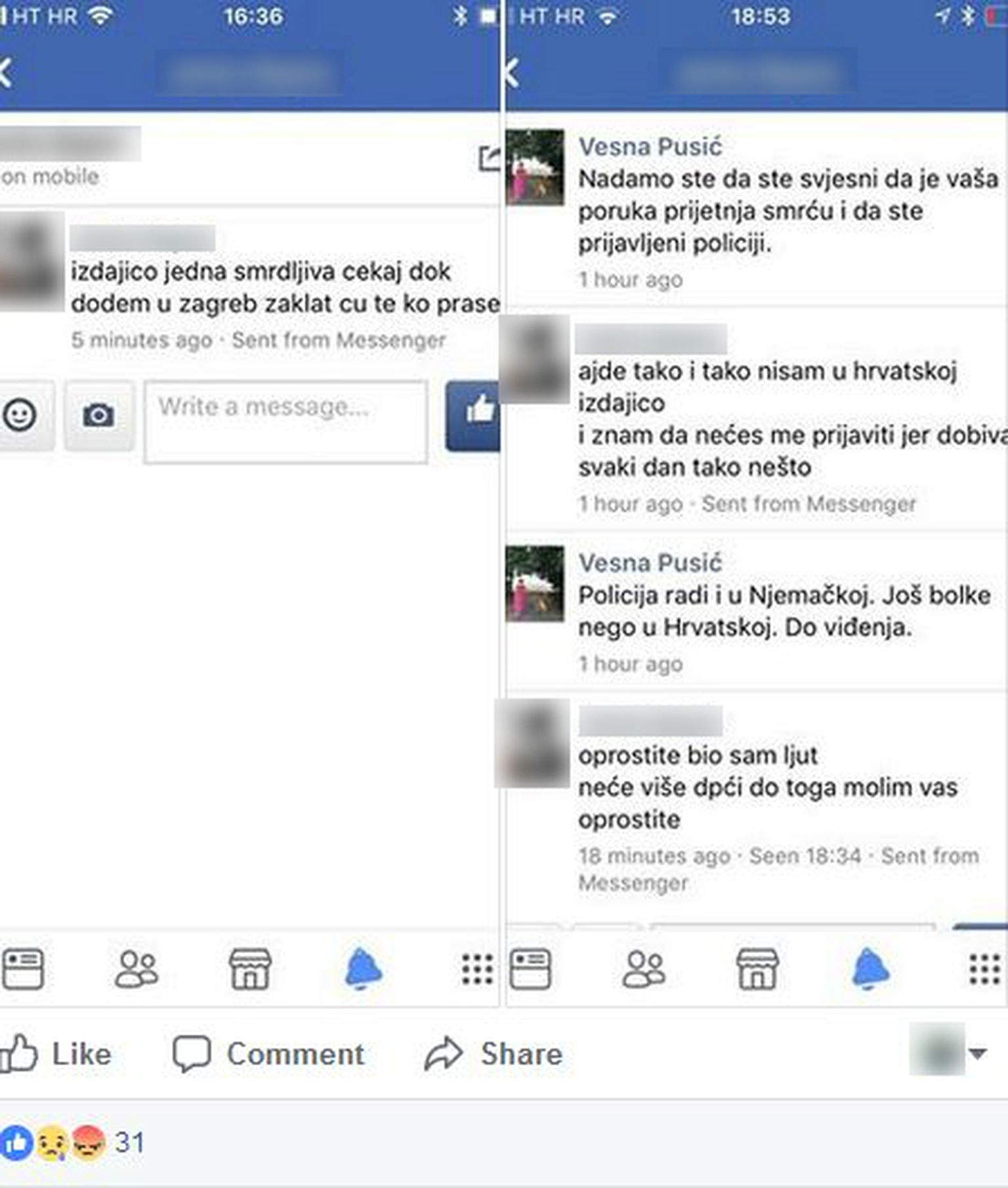 • Prepiska prijetnje smrću koju je primila Vesna Pusić te i naknadne isprike (Foto: GLAS Građansko-liberalni savez/Facebook) Foto: GLAS Gra?ansko-liberalni savez/Facebook