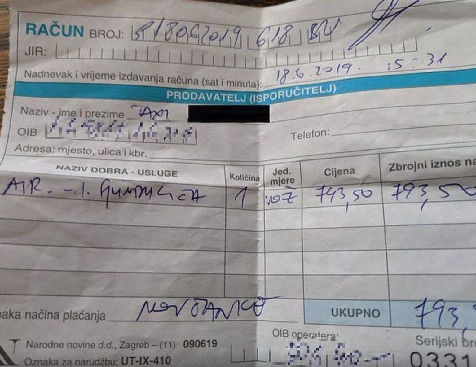 Ručno ispisan račun za vožnju (Foto: Dnevnik.hr) Foto: DNEVNIK.hr -