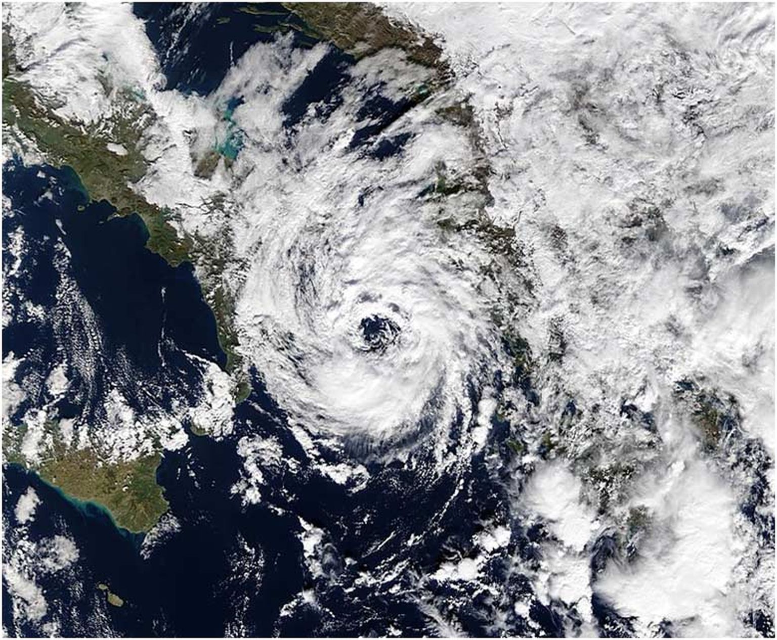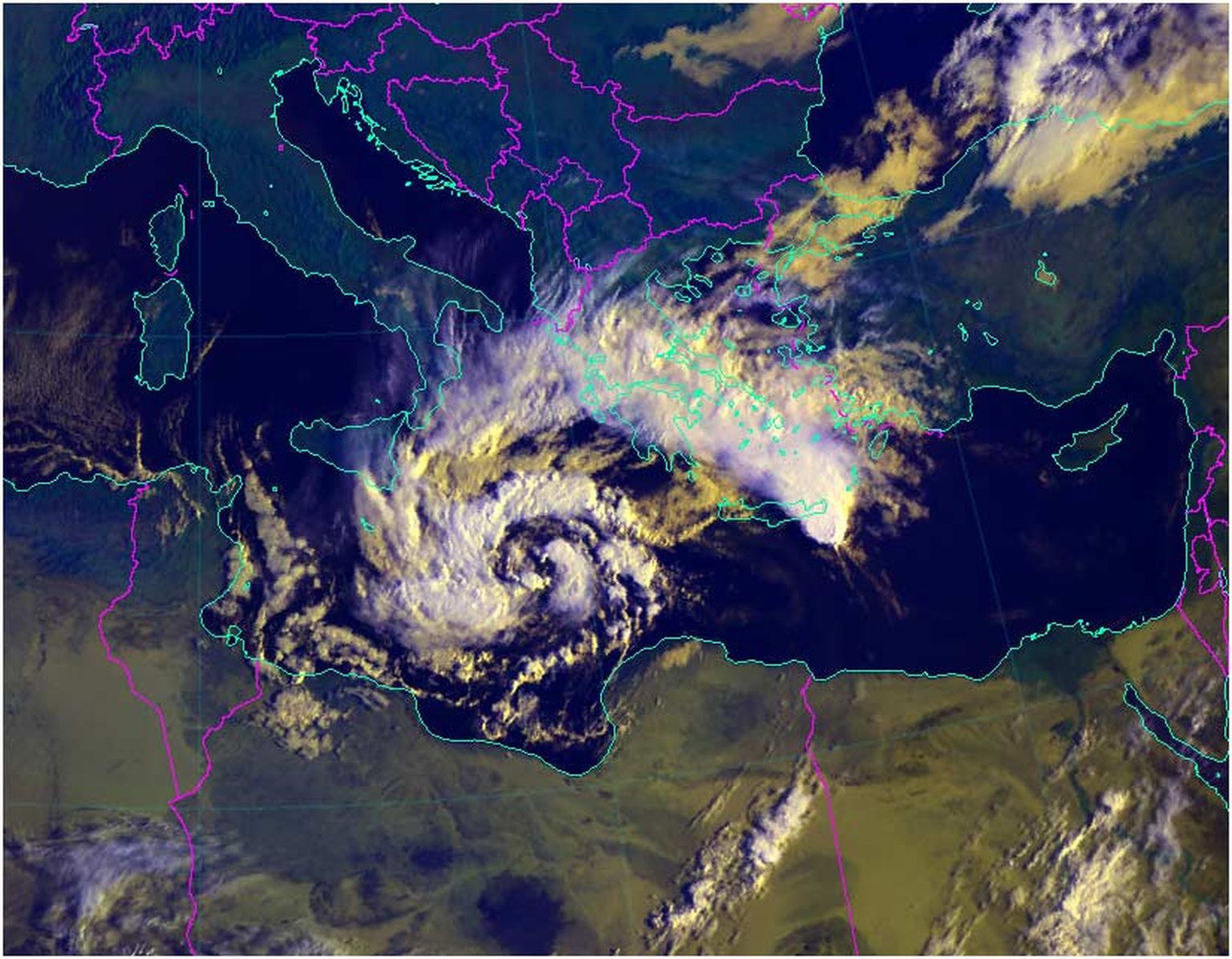 Medicane u razvijanju u Jonskom moru, 28. 9. 2018, 08:15 SEV, izvor: EUMETSAT, MSG satelit, DHMZ -