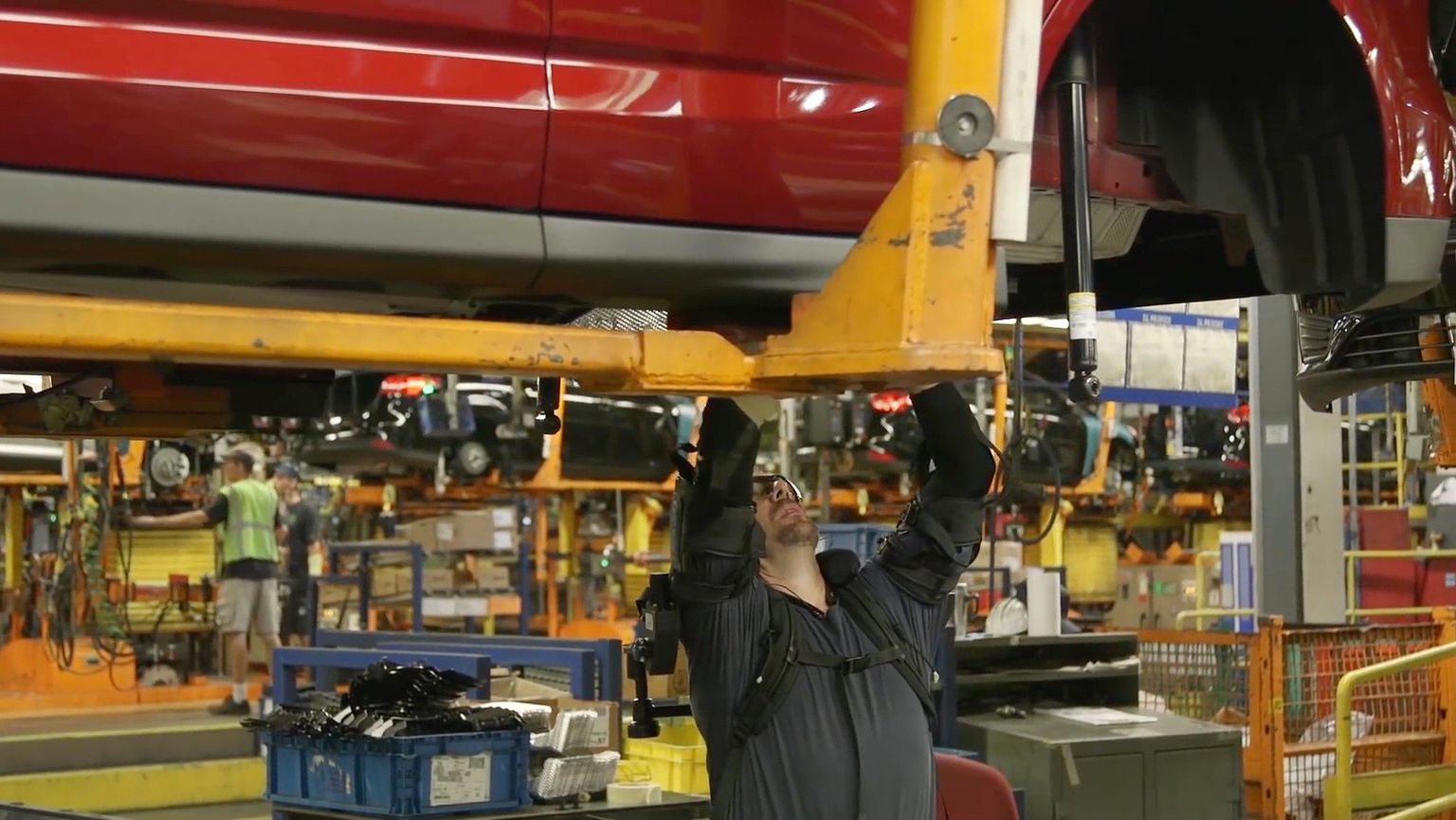 • Radnici na pokretnoj traci u Fordu dobivaju ezoskeleton prsluke (Foto: Profimedia) Foto: Profimedia