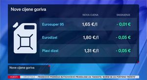Stigao je novi izračun cijena goriva i povoljniji je za vozače. Od idućeg utorka Eurosuper bi trebao stajati euro i 65 centi, što je jedan cent manje. Nova cijena eurodizela trebala bi biti euro i 80, odnosno pet centi manje. Plavi dizel mogao bi pasti na euro 31-an, odnosno za pet centi manje. Odluku o konačnim cijenama donijet će Vlada u ponedjeljak na telefonskoj sjednici.